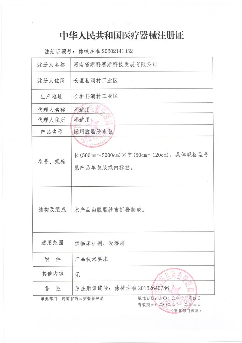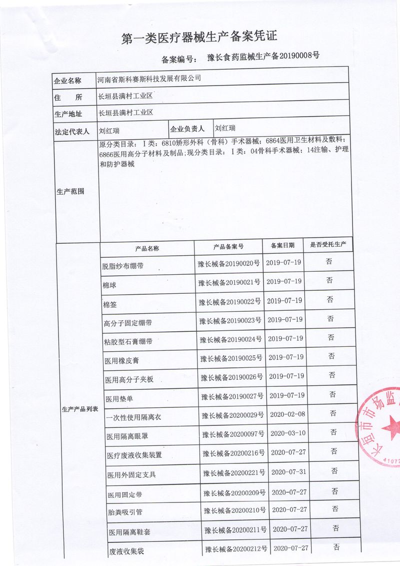 河南省斯科賽斯科技發(fā)展有限公司創(chuàng)建于 2011 年,位于“中國(guó)醫(yī)療耗材之都”- 河南省長(zhǎng)垣縣,西臨 308 省道,南靠新菏鐵路,北依長(zhǎng)濟(jì)高速,交通便捷,經(jīng)濟(jì)發(fā)達(dá),環(huán)境優(yōu)美。斯科賽斯積極進(jìn)入醫(yī)療健康和服務(wù)領(lǐng)域,秉承為用戶創(chuàng)造價(jià)值的理念,專注于醫(yī)用耗材解決方案的研發(fā)和運(yùn)營(yíng),并為用戶提供完善的產(chǎn)品解決方案;  斯科賽斯主要生產(chǎn)醫(yī)用麻醉系列、醫(yī)用高分子系列、醫(yī)用敷料包系列、醫(yī)用無(wú)紡布系列、醫(yī)用防護(hù)系列、醫(yī)用脫脂棉系列、生物材料制品類等七大類、100 多個(gè)品種、400 多個(gè)規(guī)格的產(chǎn)品。公司占地面積約 30000 平方米,建筑面積20000 平方米,擁有 10 萬(wàn)級(jí)的凈化車間總面積 10000 平方米。擁有國(guó)際先進(jìn)水平的生產(chǎn)設(shè)備和檢測(cè)儀器,技術(shù)裝備精良,檢測(cè)手段完善,為醫(yī)療行業(yè)的不斷發(fā)展進(jìn)步提供保障。公司順利通過(guò) ISO9001、ISO13485 質(zhì)量管理體系認(rèn)證。  斯科賽斯堅(jiān)持研發(fā)高科技新產(chǎn)品,力爭(zhēng)在醫(yī)療器械關(guān)鍵領(lǐng)域取得技術(shù)和研發(fā)的重大突破;立足國(guó)內(nèi)和國(guó)際兩個(gè)市場(chǎng),逐步實(shí)現(xiàn)管理理念、經(jīng)營(yíng)機(jī)制、人力資源、技術(shù)、產(chǎn)品、市場(chǎng)等全方位對(duì)接,提高企業(yè)的核心競(jìng)爭(zhēng)力;過(guò)去的歲月里,斯科賽斯砥礪前行,誠(chéng)信務(wù)實(shí),銳意進(jìn)取,不斷創(chuàng)新,用自己的睿智和辛勞,以富有責(zé)任感的使命,在探索中追求,在追求中超越,致力于成為值得信賴的醫(yī)療用品生產(chǎn)企業(yè)!在未來(lái)的日子里,斯科賽斯將一如既往豪情滿懷,信心百倍,攜手并肩,執(zhí)著追求,向更高的的目標(biāo)前進(jìn),鑄造新的輝煌!